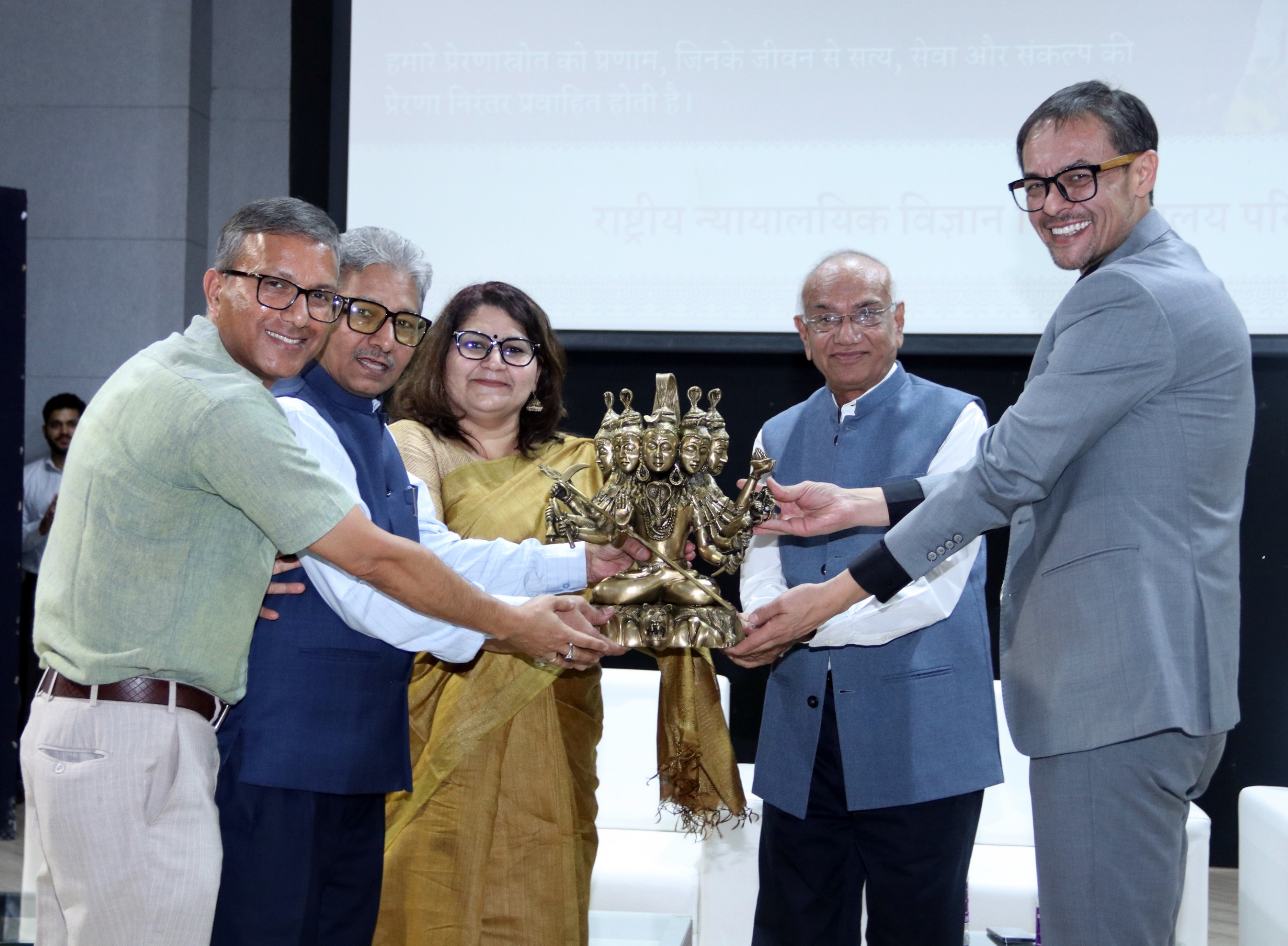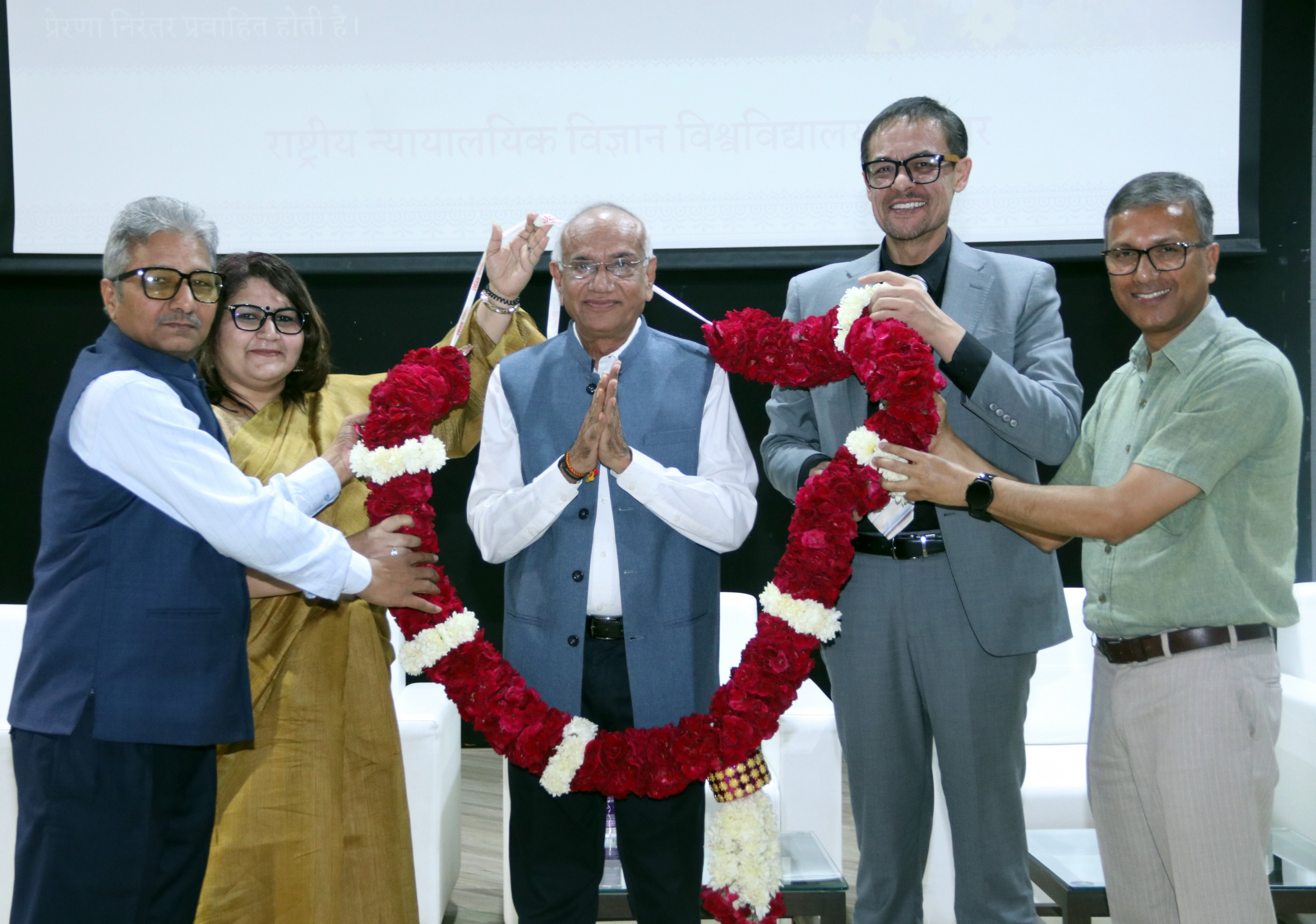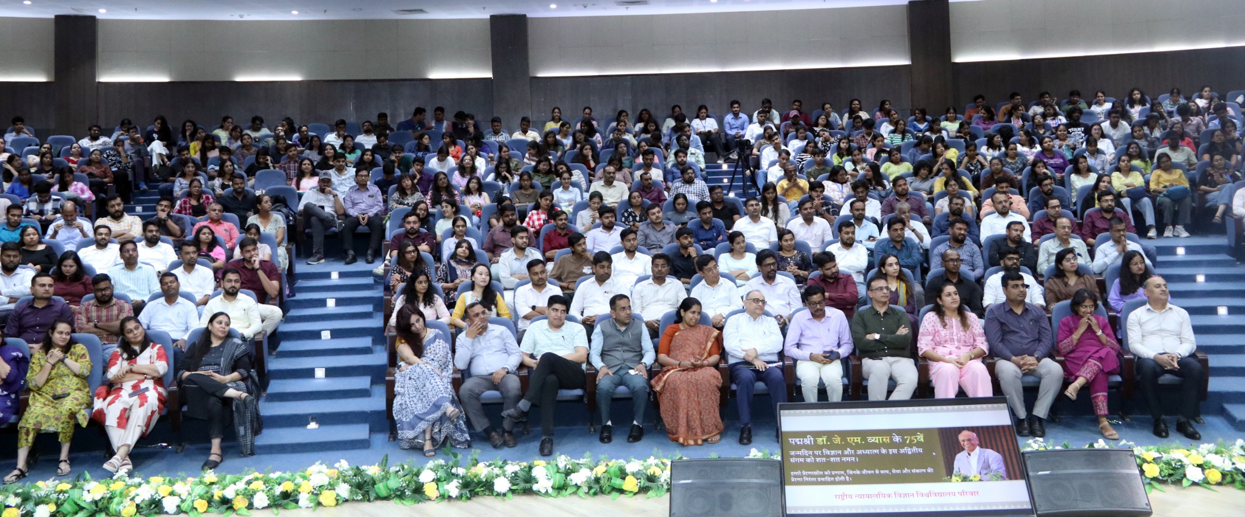 The National Forensic Sciences University (NFSU) family came together on 6th November 2025 to celebrate the 75th birthday of Padma Shri Awardee Dr. J.M. Vyas, founder Vice Chancellor of NFSU — a visionary leader who has redefined the landscape of forensic education and innovation in India. From Gandhinagar to Delhi and Bhopal, every campus resonated with heartfelt wishes and gratitude for his unparalleled contribution to science, justice, and nation-building. Students, faculty, and staff marked the occasion with enthusiasm, reflecting the spirit of unity and inspiration he embodies. The celebration also witnessed a symbolic plantation of the tree, representing wisdom, growth, and the deep roots of knowledge that Dr. Vyas has nurtured within the NFSU ecosystem. NFSU salutes the guiding light who turned vision into a living institution of excellence. As the tree of learning continues to flourish under his guidance, the NFSU fraternity renews its commitment to uphold his legacy — blending science with spirituality, innovation with integrity, and education with national service. During the function, Prof. (Dr.) S.O. Junare, Campus Director, NFSU-Gandhinagar; Prof. (Dr.) Purvi Pokhariyal, Campus Director, NFSU-Delhi; Prof. (Dr.) Satish Kumar, Campus Director, NFSU-Bhopal; and Prof. (Dr.) Said Gulyamov, Head of the Department of Cyber Law, Tashkent State University of Law (TSUL), were present on the dais. They felicitated the Hon’ble Vice Chancellor with a garland and a statue of Lord Shiva. Students, faculty members, and staff also participated in the celebration.