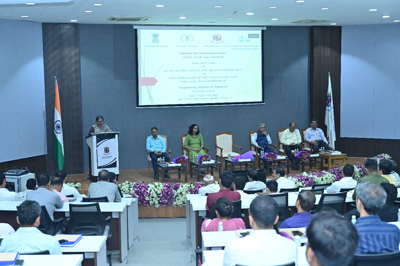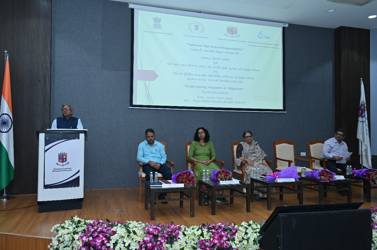 A one-day workshop on “Engineering Aspects in Vigilance” was held at the NFSU Auditorium, Gandhinagar, on 6th November 2025, as part of Vigilance Awareness Week-2025. The event was successfully conducted and jointly organized by the Gujarat Vigilance Commission, the Technical Departments of the Government of Gujarat, and the National Forensic Sciences University (NFSU).