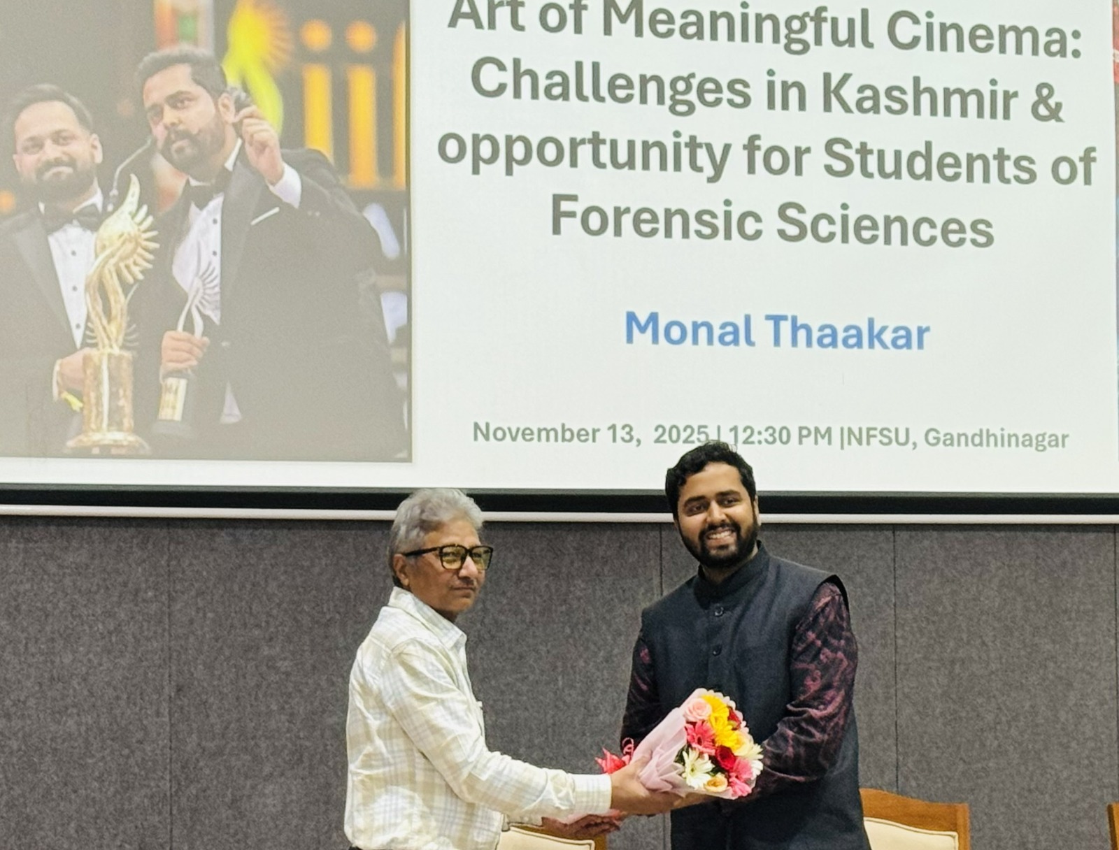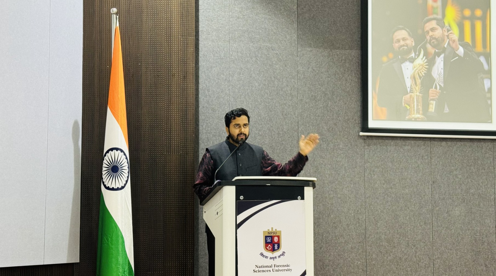 The National Forensic Sciences University (NFSU), Gandhinagar, successfully conducted a Distinguished Talk titled “Art of Meaningful Cinema: Challenges in Kashmir and Opportunities for Students of Forensic Sciences”, delivered by acclaimed screenwriter Mr. Monal Thaakar, a Filmfare Award winner for Best Story on 13th November, 2025. Prof. (Dr.) S.O. Junare, Campus Director of NFSU-Gandhinagar, felicitated Mr. Monal Thaakar. Mr. Monal Thaakar, screenwriter of the films Article 370 (2024) and Baramulla, delivered an insightful address on the evolving landscape of cinema, the socio-cultural complexities of Kashmir, and the emerging opportunities for forensic science students in content analysis, media research, and investigative storytelling. The session offered valuable perspectives and enhanced interdisciplinary learning at NFSU. During the Distinguished Talk, Aircommodore Kedar Thakaar, Campus Director, NFSU-Uganda, Faculty members and students of NFSU were present.